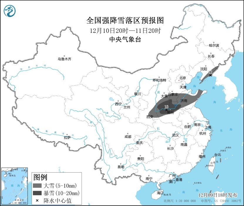 預(yù)計(jì),12月9日20時(shí)至12月11日20時(shí),陜西中部和北部、山西中南部、河北南部、河南北部、山東中北部、遼寧東部、吉林東南部等地的部分地區(qū)有大到暴雪,上述地區(qū)新增積雪深度5~10厘米,局地12~15厘米。主要降雪時(shí)段為10日。