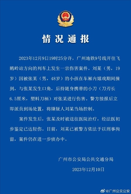 ·警方通報“廣州地鐵9號線持刀傷人事件”,廣州地鐵回應(yīng):涉案刀具不在管制范圍內(nèi)。