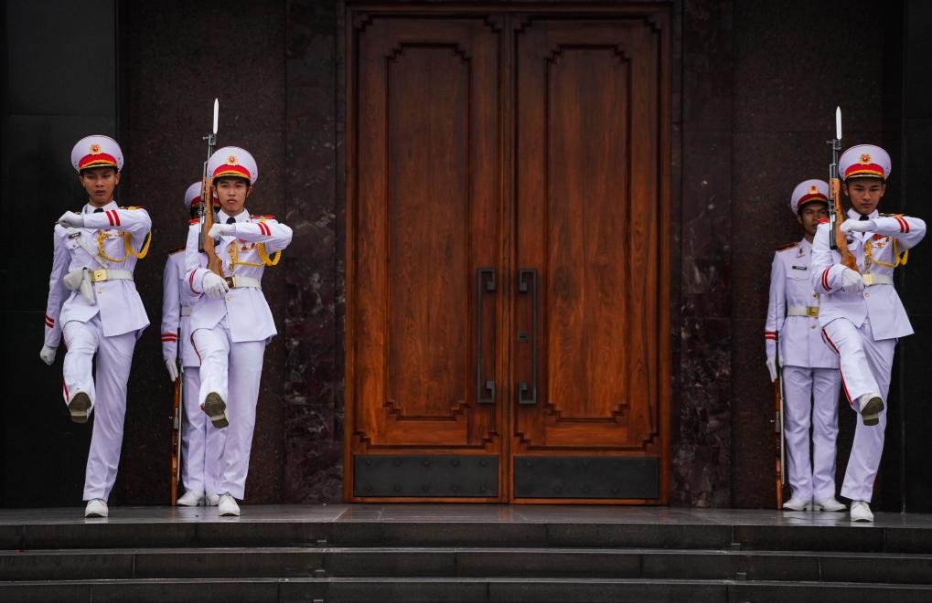在河內(nèi)地標(biāo)巴亭廣場一側(cè),坐落著胡志明陵和胡志明故居。記者抵達(dá)廣場時,守衛(wèi)胡志明陵的儀仗兵正在舉行換崗儀式,眾多民眾和游客高舉相機(jī)或手機(jī),記錄下這莊嚴(yán)肅穆的一刻。胡志明陵北側(cè)的胡志明故居內(nèi),各國游客排起長隊(duì),在他曾長期居住和工作的高腳屋下駐足留影。