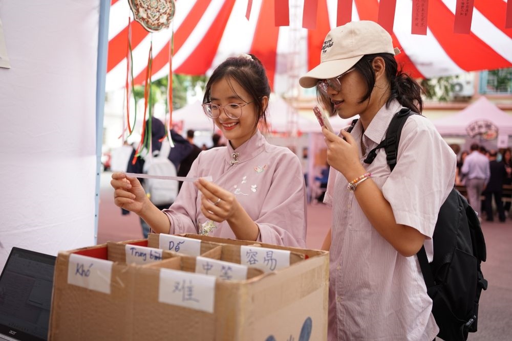 2023年11月1日,越南大學(xué)生在河內(nèi)大學(xué)“同唱一首歌”中國—東盟青年影視歌會(huì)活動(dòng)現(xiàn)場參與猜謎語游戲。