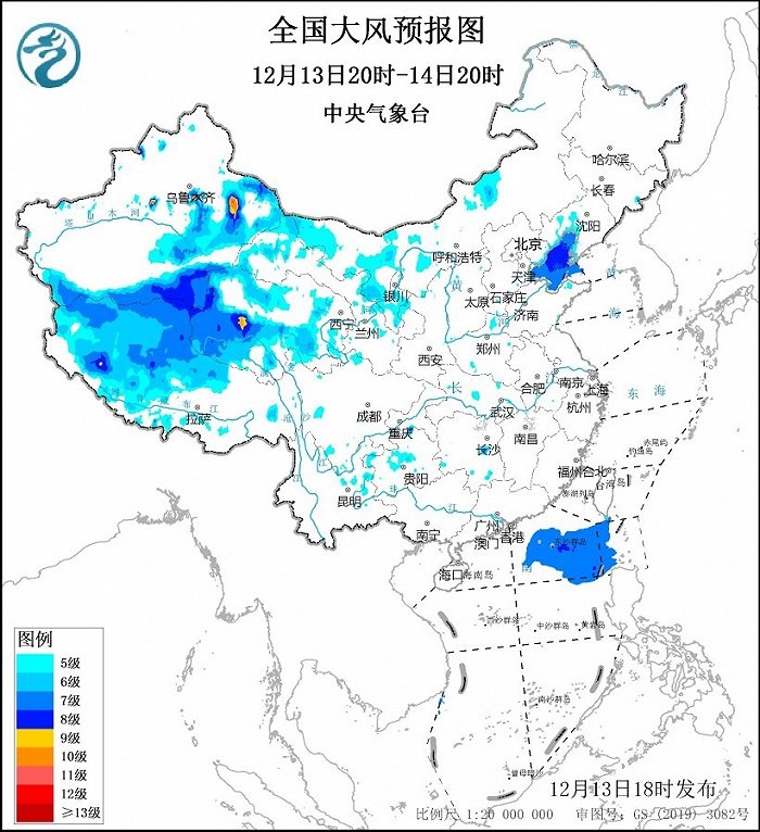 預(yù)計,12月13日20時至14日20時,新疆東部和南疆盆地、內(nèi)蒙古中西部、寧夏、西藏西部、青海等地部分地區(qū)有5~6級、陣風(fēng)7~8級的大風(fēng),其中,新疆山口地區(qū)、青海西部、西藏西北部等地部分地區(qū)有7~9級、陣風(fēng)10~11級的大風(fēng);渤海、南海東北部部分海域?qū)⒂?~8級、陣風(fēng)9級的大風(fēng)。