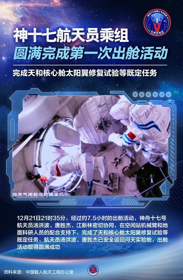 據(jù)中國載人航天工程辦公室介紹,21日21時35分,經(jīng)過約7.5小時的出艙活動,神舟十七號航天員湯洪波、唐勝杰、江新林密切協(xié)同,在空間站機(jī)械臂和地面科研人員的配合支持下,完成了天和核心艙太陽翼修復(fù)試驗等既定任務(wù),航天員湯洪波、唐勝杰已安全返回問天實驗艙,出艙活動取得圓滿成功。