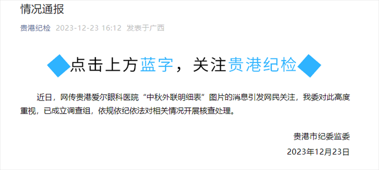 ·貴港市紀委通報“網(wǎng)傳愛爾眼科中秋外聯(lián)明細表”:已成立調(diào)查組,對相關(guān)情況開展核查處理。據(jù)早前報道,網(wǎng)友爆料發(fā)布了兩張標為“中秋外聯(lián)明細表”的圖片,其中涉及42名公職人員以及59000元額度的購物卡,并在評論中透露上述圖片的涉事單位為貴港愛爾眼科醫(yī)院。