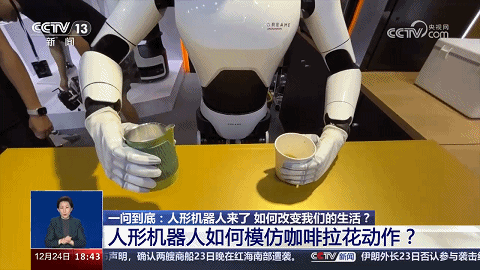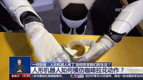2023年8月,2023世界機(jī)器人大會(huì)在北京開幕,現(xiàn)場有個(gè)人形機(jī)器人可以模仿“咖啡拉花”動(dòng)作——開始,把兩個(gè)杯子(裝有咖啡、牛奶)遞給人形機(jī)器人;稍后,人形機(jī)器人運(yùn)行AI智能算法,指揮它用“手”完成“咖啡拉花”作業(yè)。