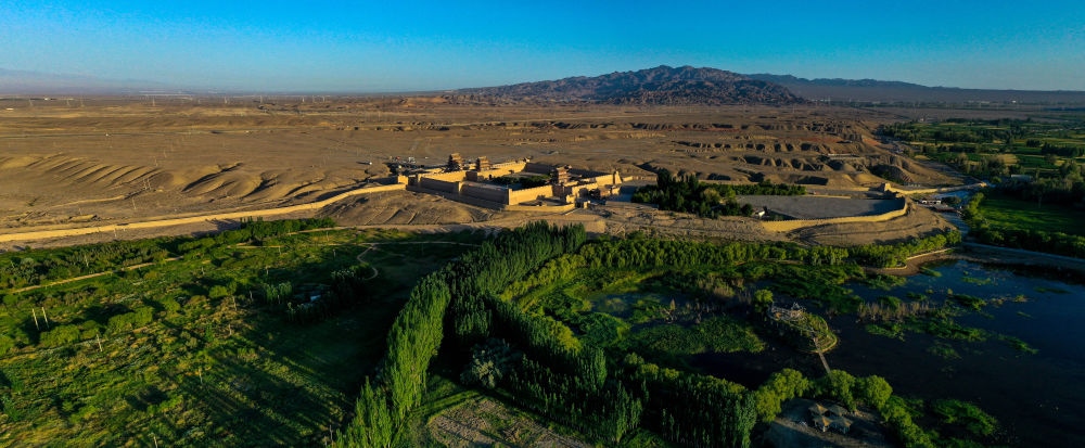 甘肅省敦煌市陽(yáng)關(guān)遺址前的綠洲(2013年9月5日攝)。