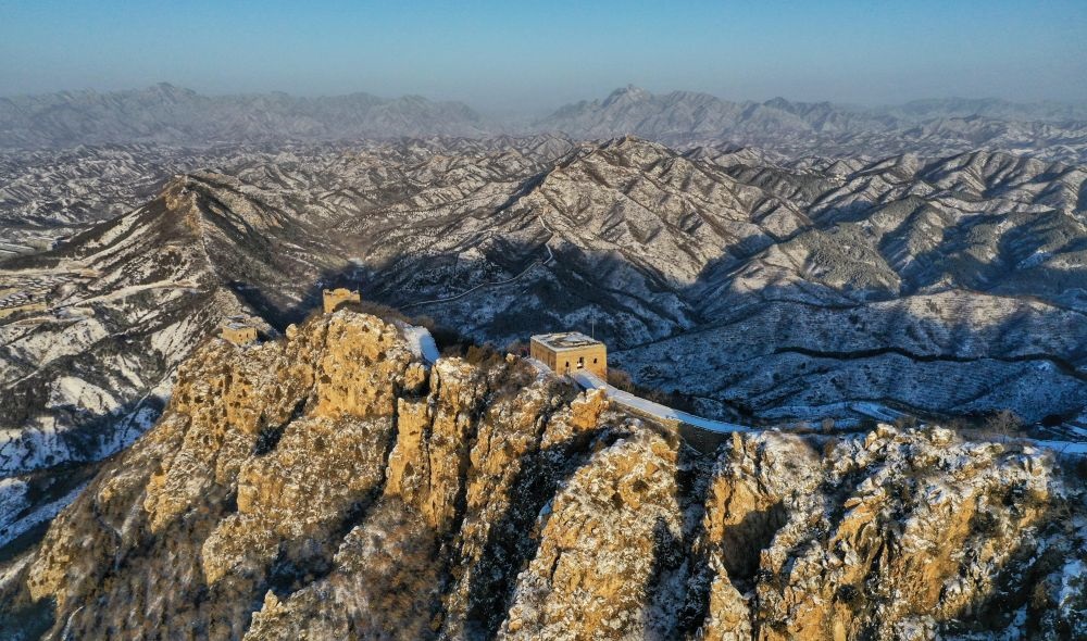 朝陽(yáng)灑在雪后的居庸關(guān)長(zhǎng)城上(無(wú)人機(jī)照片,2023年12月16日攝)。