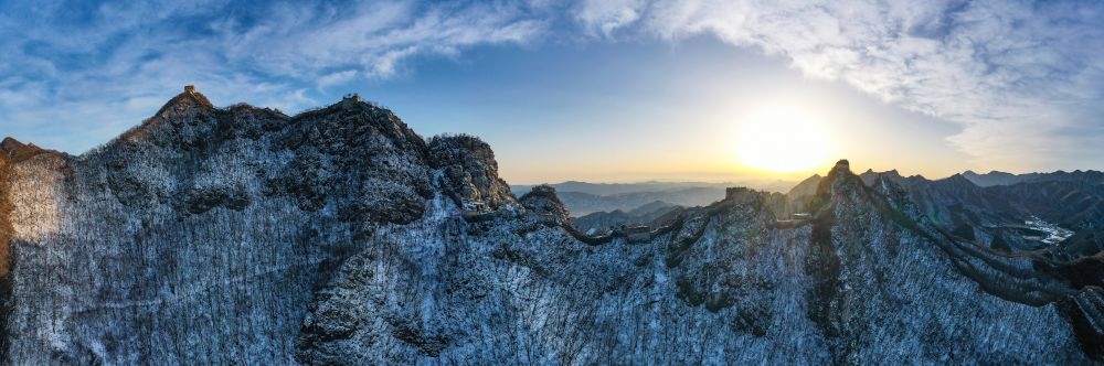 夕陽(yáng)下的北京箭扣長(zhǎng)城(無(wú)人機(jī)全景照片,2023年2月13日攝)。