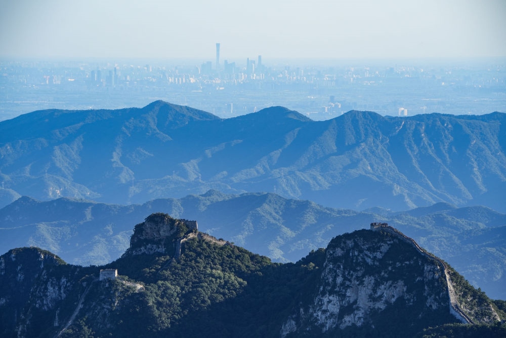 箭扣長(zhǎng)城和遠(yuǎn)處北京城區(qū)的建筑群(2022年9月5日攝)。