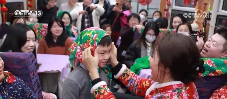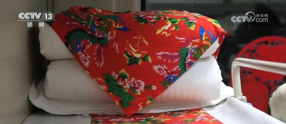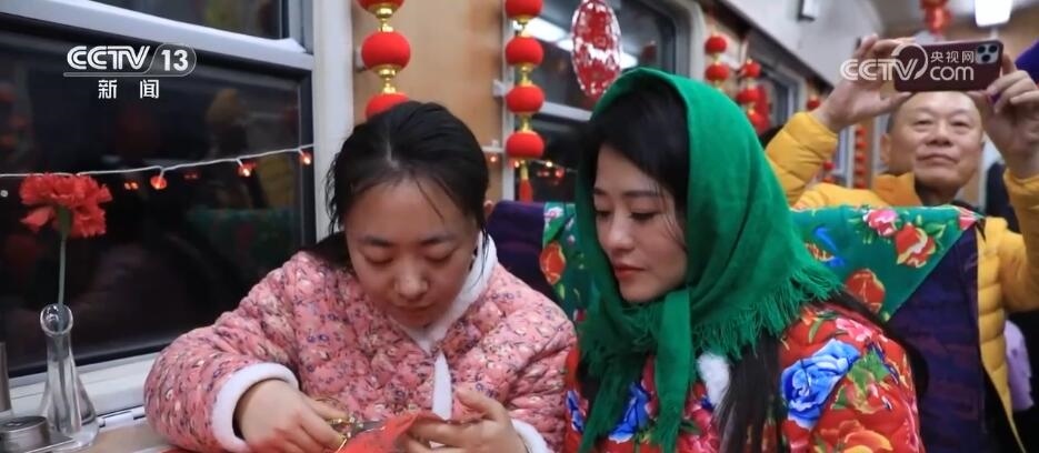 總臺央視記者 楊曜語:一上車,我就被濃濃的東北文化所感染到了,整個車廂都被東北大花的經(jīng)典配色裝飾著,再加上隨手就能品嘗到的特色美食,坐在床鋪上就感覺一秒鐘“穿越”到農(nóng)家炕頭。跟著游客,我現(xiàn)在到了一節(jié)互動車廂,這里被布置成“跨年狂歡”的主題場景,在這里游客可以參與剪窗花、包餃子、穿東北大花襖一系列特色活動,現(xiàn)在就有很多游客在這里打卡拍照。