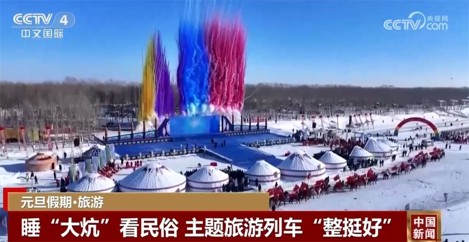 總臺(tái)央視記者 楊曜語(yǔ):我即將登上的列車就是從哈爾濱開往漠河的國(guó)內(nèi)首個(gè)沉浸式東北民俗文化體驗(yàn)列車,坐過的人都說一上車就想盤腿兒了,我們趕緊來體驗(yàn)一下!一上車我就被濃濃的東北文化所感染到了,整個(gè)車廂都被東北大花的經(jīng)典配色裝飾著,再加上隨手就能品嘗到東北特色美食,坐在床鋪上就感覺一秒鐘“穿越”到農(nóng)家炕頭。
