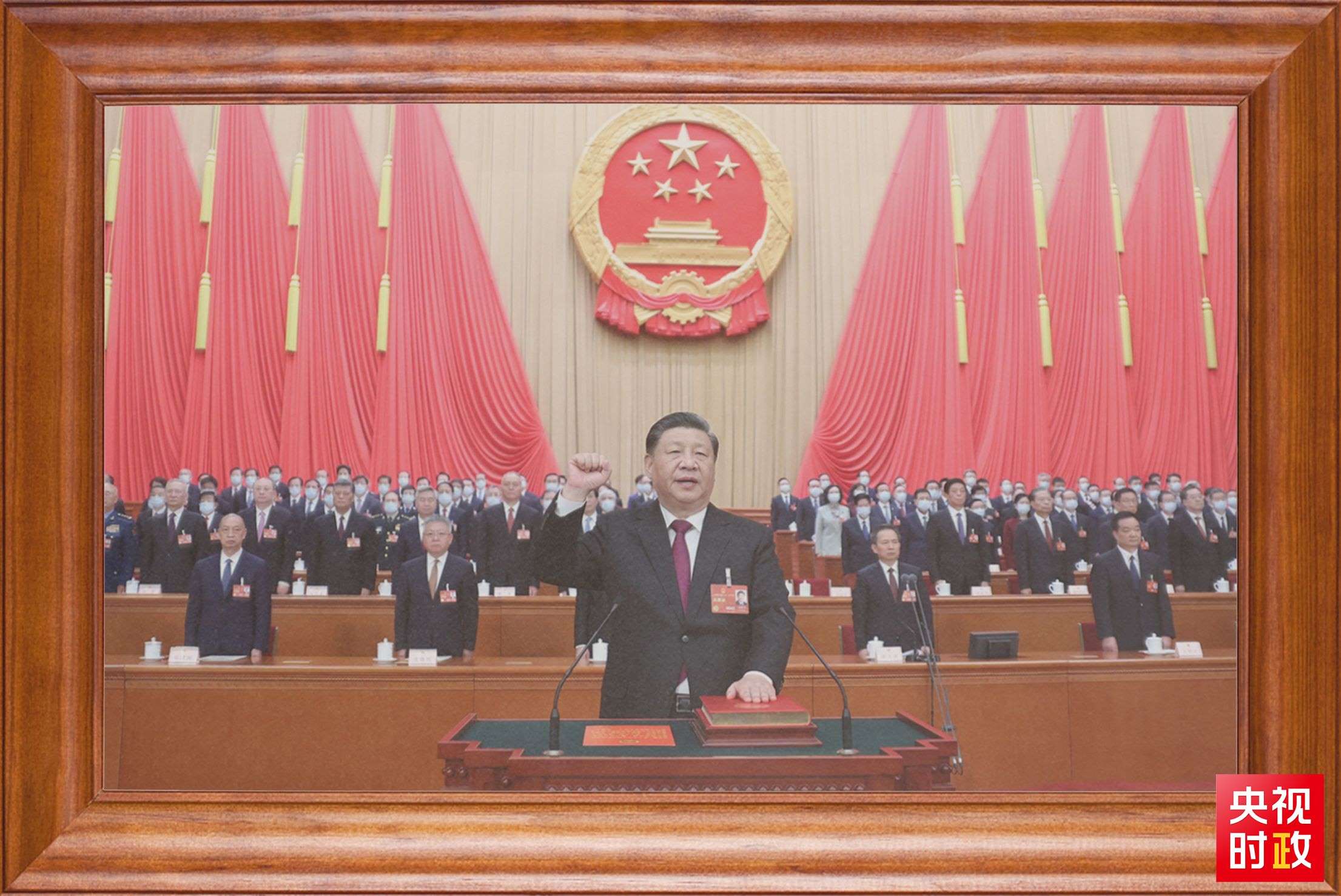 還有一張?zhí)貏e的照片。2023年3月10日,在北京人民大會(huì)堂,全票當(dāng)選國(guó)家主席、中央軍委主席的習(xí)近平,左手撫按《中華人民共和國(guó)憲法》,右手舉拳,面向近3000名全國(guó)人大代表,鄭重宣誓。