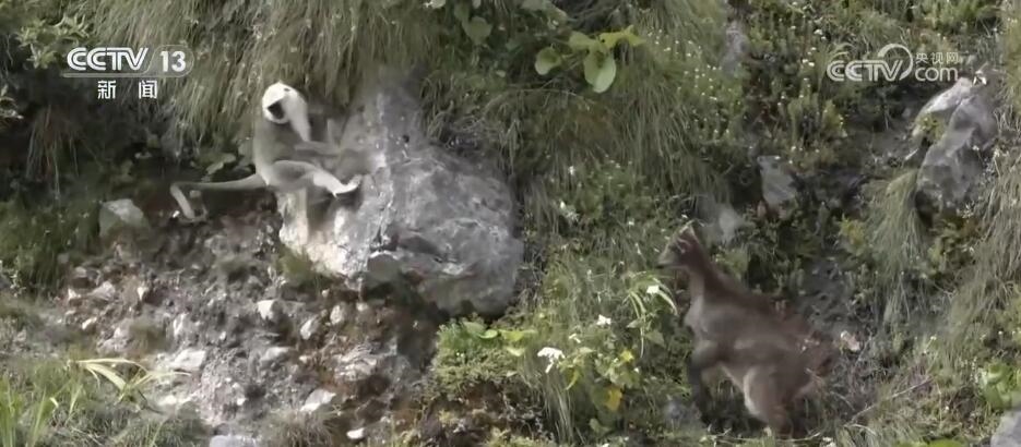 突然,林間騷動起來,幾只長尾葉猴從天而降來到塔爾羊中間,這是首次記錄到這兩個物種群體同框覓食的珍貴畫面。對它們而言,聚在一起可以加強警戒,更容易發(fā)現(xiàn)天敵。