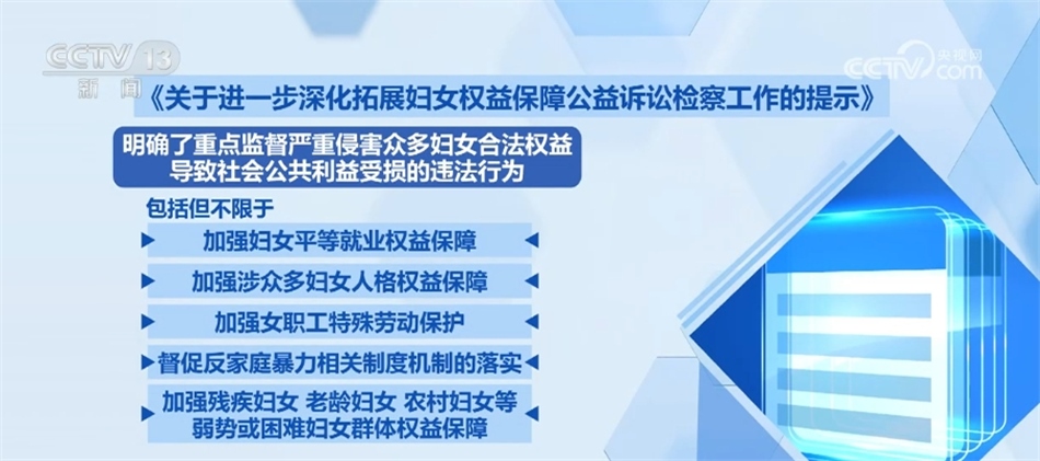 《工作提示》明確了重點監(jiān)督嚴重侵害眾多婦女合法權益導致社會公共利益受損的違法行為,包括但不限于:加強婦女平等就業(yè)權益保障,加強涉眾多婦女人格權益保障,加強女職工特殊勞動保護,督促反家庭暴力相關制度機制的落實,加強殘疾婦女、老齡婦女、農村婦女等弱勢或困難婦女群體權益保障。同時,針對其他與眾多婦女權益密切相關的領域加強監(jiān)督。