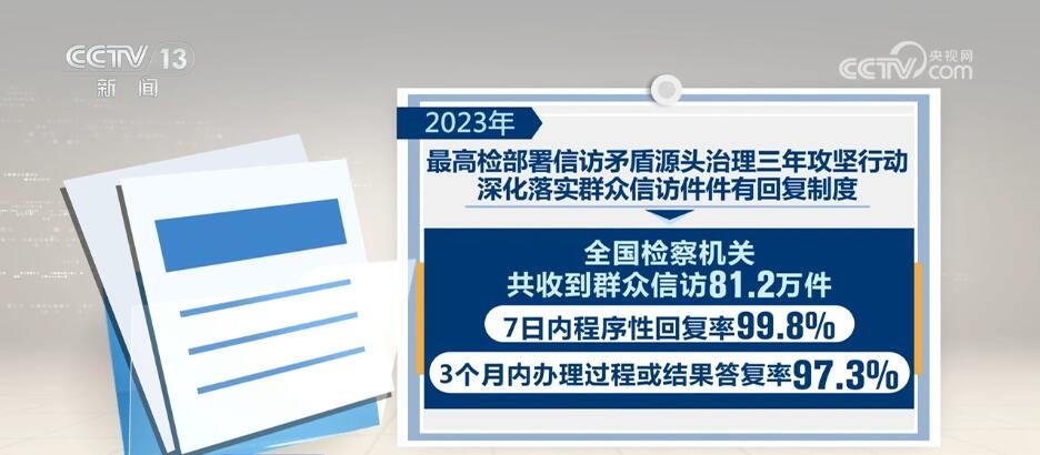 2023年,最高檢部署信訪矛盾源頭治理三年攻堅行動,深化落實(shí)群眾信訪件件有回復(fù)制度。全國檢察機(jī)關(guān)共收到群眾信訪81.2萬件,7日內(nèi)程序性回復(fù)率99.8%,3個月內(nèi)辦理過程或結(jié)果答復(fù)率97.3%。