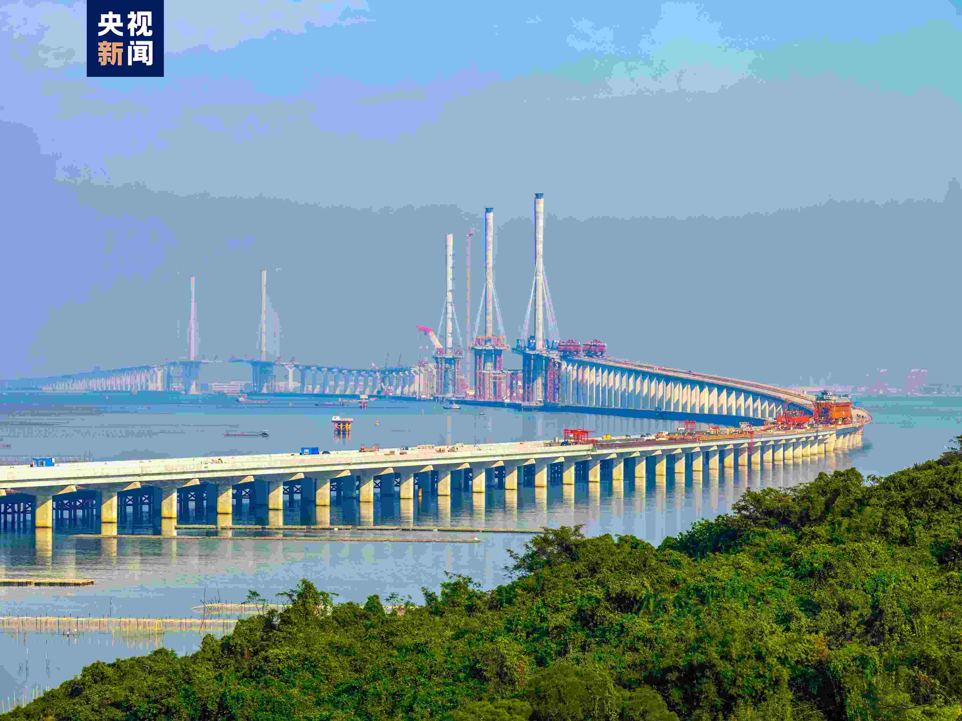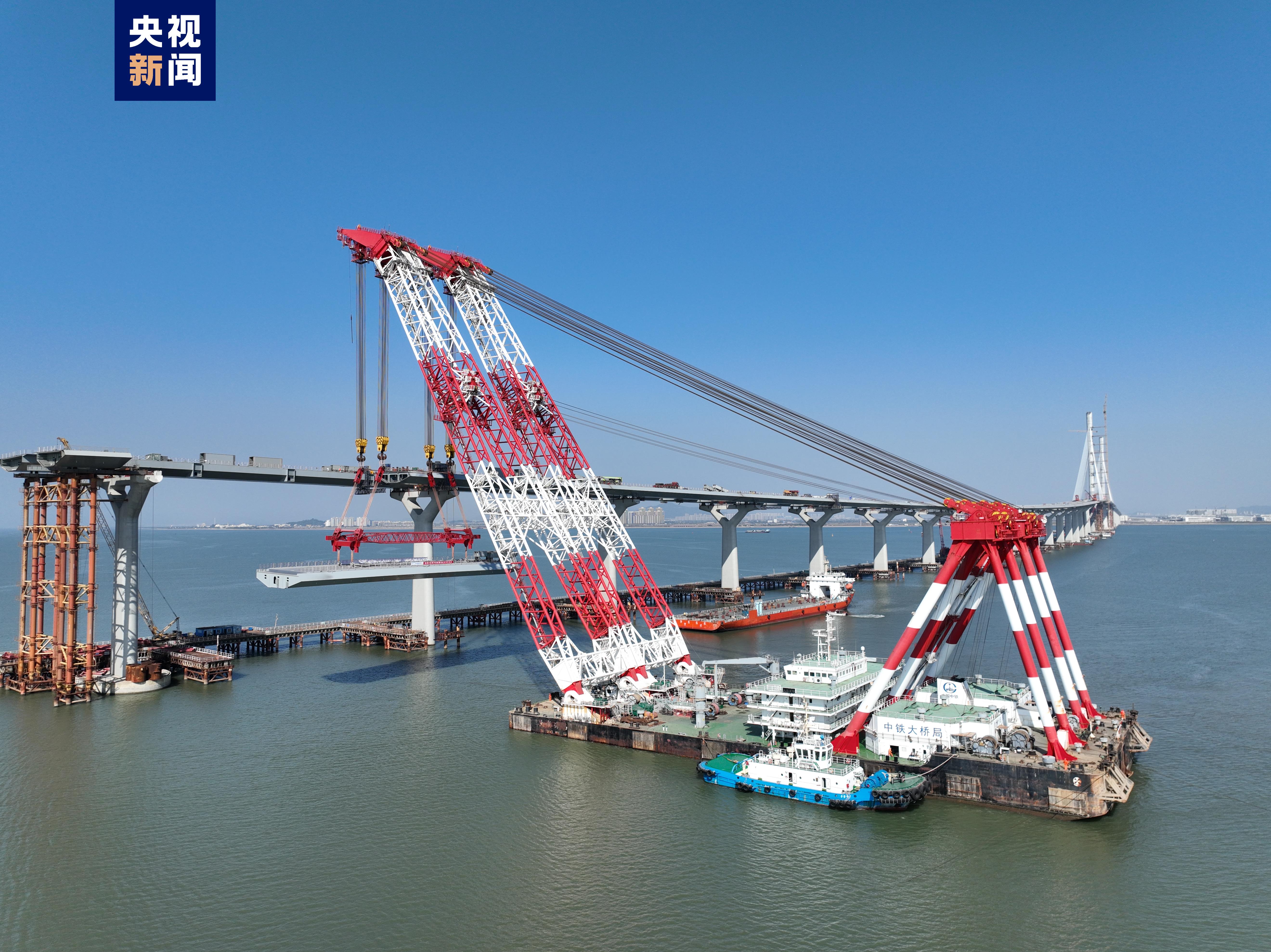 截至目前,黃茅??绾Mǖ赖奈遄魉蛢勺淼谰呀ㄔO(shè)完成,上部結(jié)構(gòu)施工持續(xù)進行中,黃茅海大橋東塔鋼箱梁架設(shè)完成5節(jié)、中塔鋼箱梁架設(shè)完成9節(jié)、西塔鋼箱梁架設(shè)完成15節(jié);高欄港大橋東塔鋼箱梁架設(shè)完成31節(jié)、西塔鋼箱梁架設(shè)完成33節(jié)。