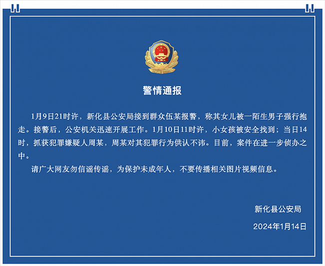 ·網(wǎng)傳湖南一女童在樓道被男子強(qiáng)行抱走?警方通報:犯罪嫌疑人已被抓獲。
