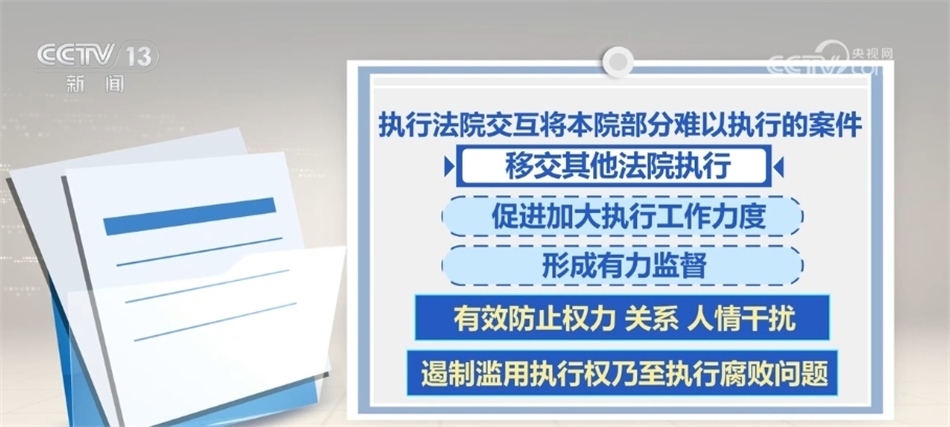 2023年10月,最高人民法院部署開(kāi)展交叉執(zhí)行工作試點(diǎn)。據(jù)介紹,交叉執(zhí)行是指通過(guò)指定、提級(jí)執(zhí)行,執(zhí)行法院交互將本院部分難以執(zhí)行的案件移交其他法院執(zhí)行,促進(jìn)加大執(zhí)行工作力度,并形成有力監(jiān)督,有效防止權(quán)力、關(guān)系、人情干擾,遏制濫用執(zhí)行權(quán)乃至執(zhí)行腐敗問(wèn)題。