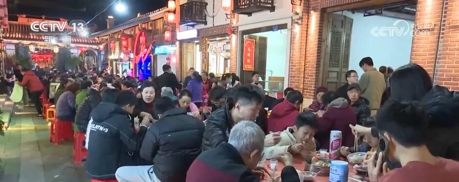 當晚,在莆田市興化府歷史文化街區(qū),老街小巷縱橫交錯,古建筑連成一片,居民們圍坐在一起品美食、拉家常,歡聲笑語不絕于耳。后廚的廚師們忙著準備各種食材,精心烹飪出一道道具有當?shù)靥厣拿牢都央?,現(xiàn)場洋溢著歡樂喜慶的節(jié)日氛圍。與往年相比,今年的“尾牙宴”規(guī)模約擴大了一倍,有2000多人參加,足足擺了200多桌。