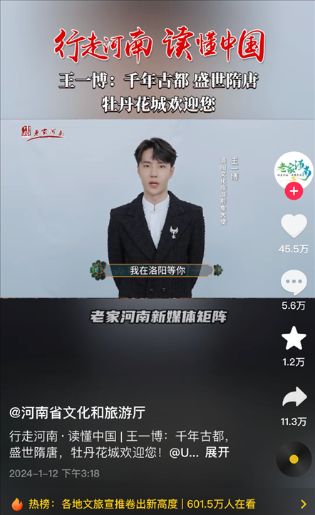 有人統(tǒng)計(jì),自1月9日起,河南文旅官方賬號(hào)“河南省文化和旅游廳”每天發(fā)布二三十條視頻,連續(xù)四天發(fā)布了112條視頻,持續(xù)展示本地文旅資源,吸引了近百萬(wàn)新粉絲,主打一個(gè)“量變總會(huì)引起質(zhì)變”,以至于“河南文旅到底發(fā)了多少抖音”相關(guān)話題成為熱門(mén)搜索。
