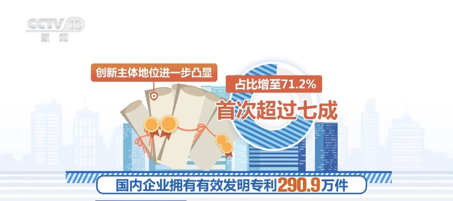 截至2023年底,我國國內(nèi)擁有有效發(fā)明專利的企業(yè)達42.7萬家,較上年增加7.2萬家。國內(nèi)企業(yè)擁有有效發(fā)明專利290.9萬件,占比增至71.2%,首次超過七成,創(chuàng)新主體地位進一步凸顯。