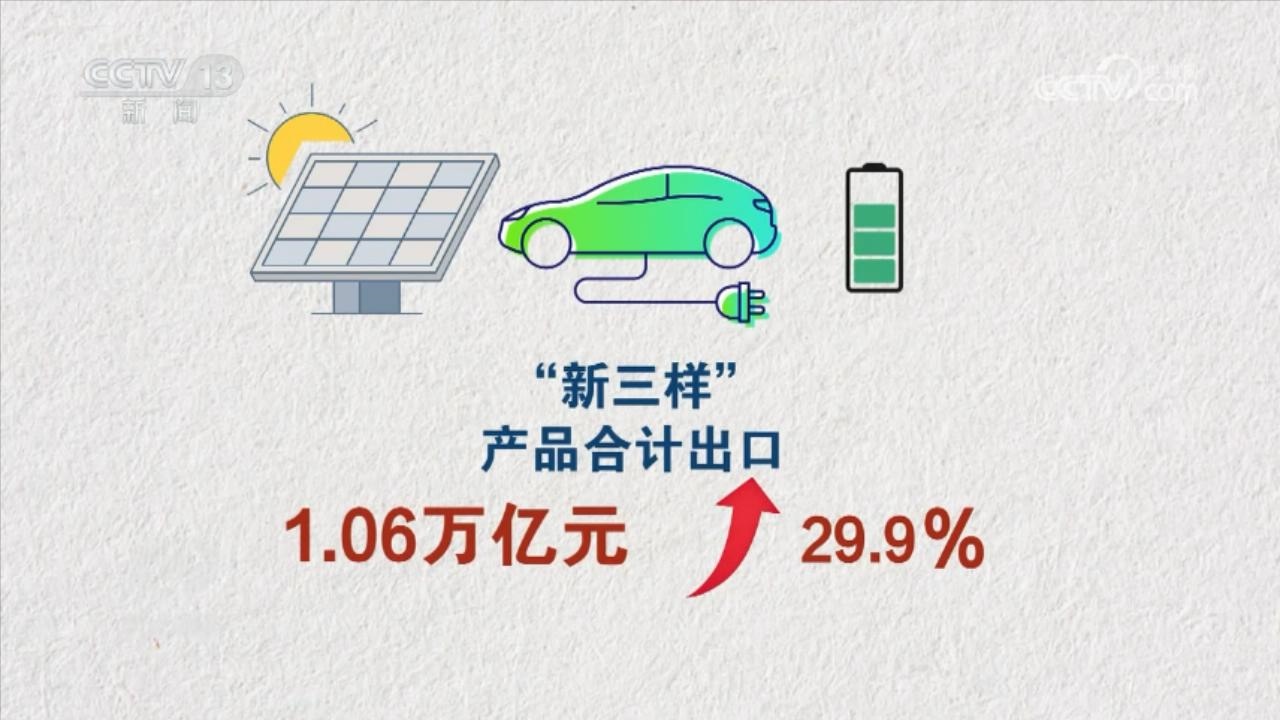 2023年,我國(guó)出口機(jī)電產(chǎn)品13.92萬億元,增長(zhǎng)了2.9%,占出口總值的58.6%;同期勞動(dòng)密集型產(chǎn)品出口4.11萬億元,占出口總值的17.3%。機(jī)電產(chǎn)品中,電動(dòng)載人汽車、鋰離子蓄電池及太陽能電池“新三樣”產(chǎn)品合計(jì)出口1.06萬億元,首次突破萬億元大關(guān),增長(zhǎng)了29.9%。船舶、家用電器的出口分別增長(zhǎng)35.4%和9.9%。