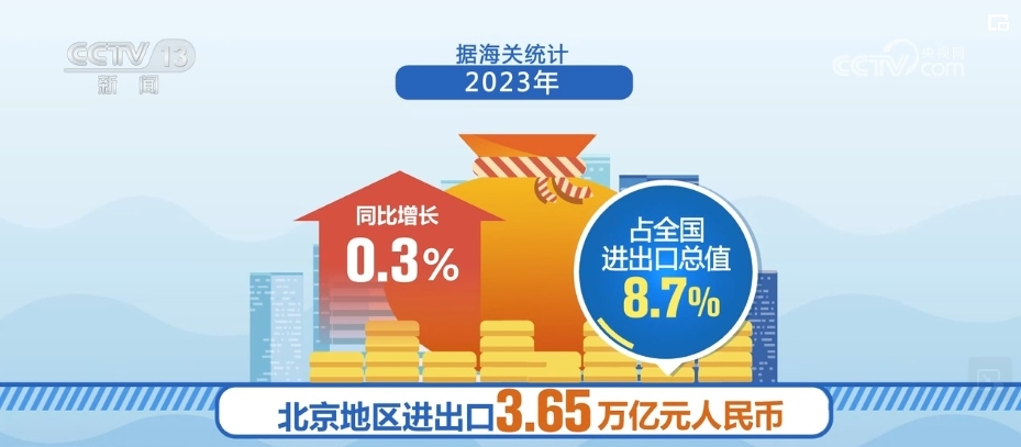 據(jù)海關(guān)統(tǒng)計(jì),2023年,北京地區(qū)進(jìn)出口3.65萬(wàn)億元人民幣,同比增長(zhǎng)0.3%,占全國(guó)進(jìn)出口總值的8.7%。