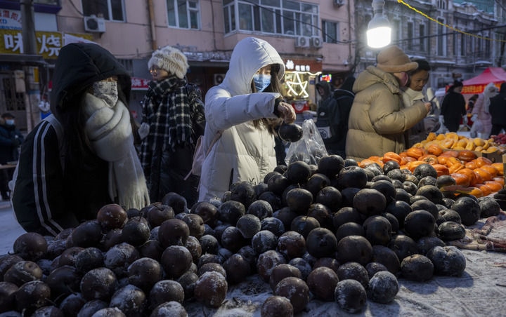 ?2024年1月22日,在黑龍江哈爾濱紅專街早市,游客挑選凍梨和凍柿子。新華社記者 才揚(yáng) 攝