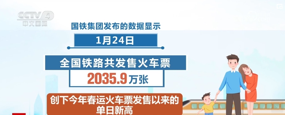 國鐵集團發(fā)布的數據顯示,1月24日,全國鐵路共發(fā)售火車票2035.9萬張,創(chuàng)下2024年春運火車票發(fā)售以來的單日新高,這標志著節(jié)前售票高峰已經到來。
