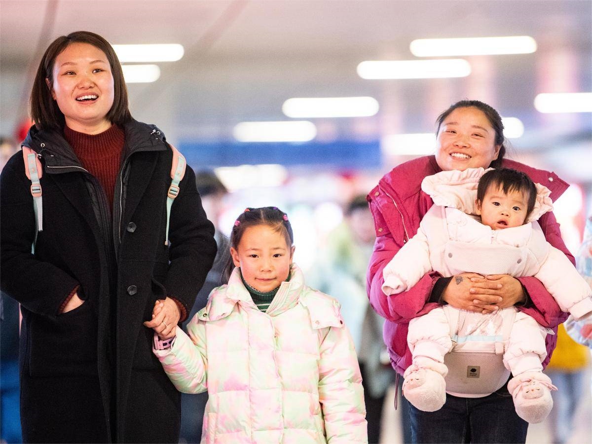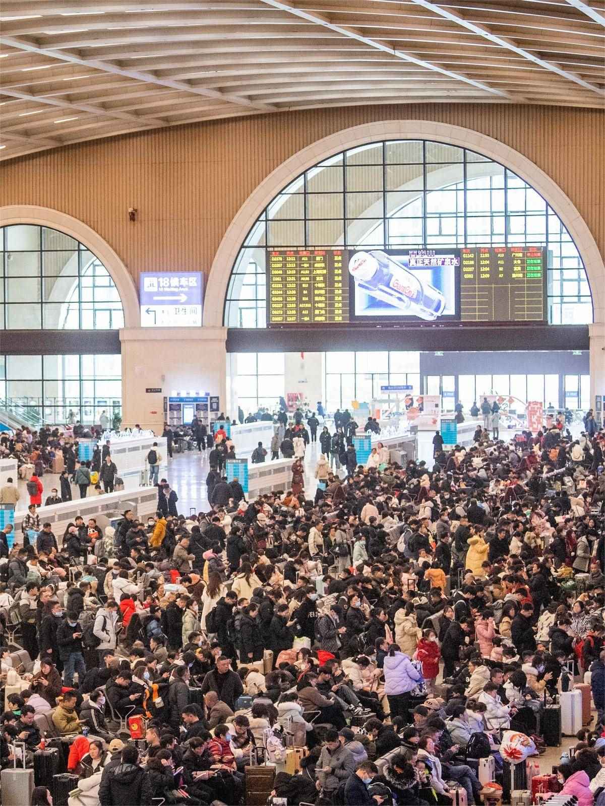 在武漢漢口火車站內(nèi),人潮涌動,大批旅客攜帶行李踏上歸家旅途。(湖北日報全媒記者 何宇欣 通訊員 陳新琳 攝)