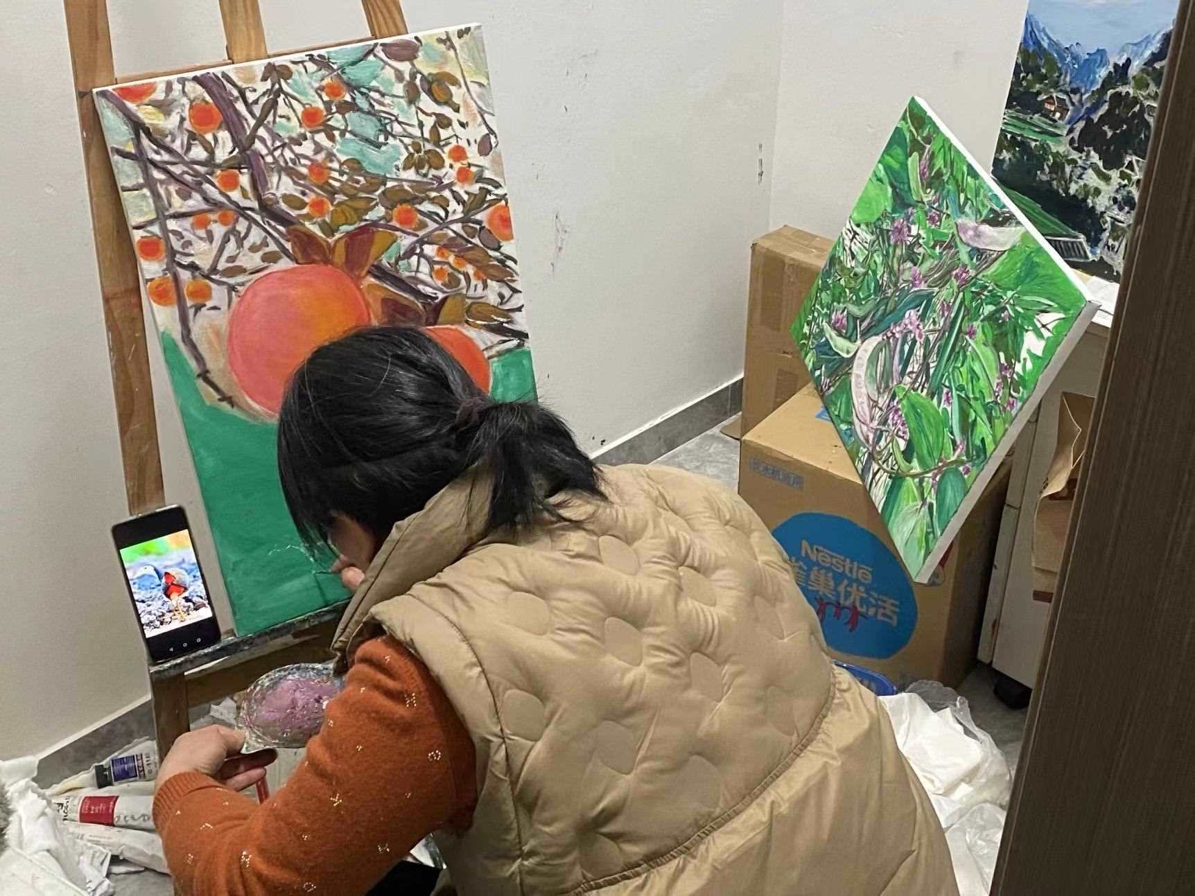 衛(wèi)生間一旁的儲(chǔ)物間里,擠滿了王柳云的畫(huà)作:河邊的野鴨,雷電亮起的剎那,還有富春山的冬和夏。40乘60厘米的畫(huà)布上,那些樹(shù)木,那些花草,香了滿世界。