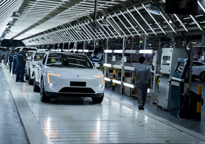 在重慶市長(zhǎng)安汽車生產(chǎn)基地車間內(nèi),新能源汽車阿維塔生產(chǎn)下線。新華社記者李前磊 攝
