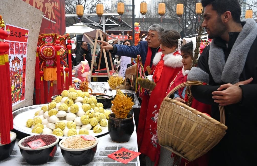 2月2日,在西安永興坊舉行的小年活動上,來自西安各大學(xué)的留學(xué)生在民俗專家的講解下了解小年祭灶所用的物品。新華社記者 劉瀟 攝