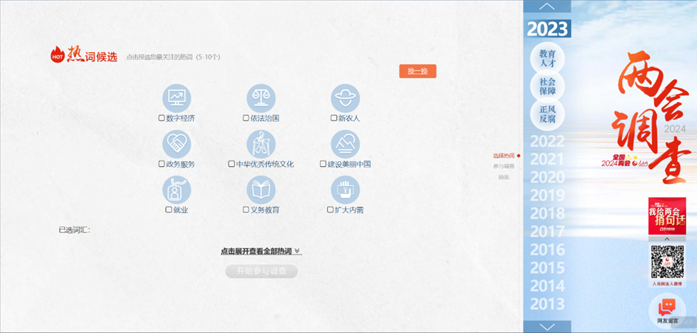 1、登錄人民網(wǎng)2024年全國兩會調(diào)查頁面。