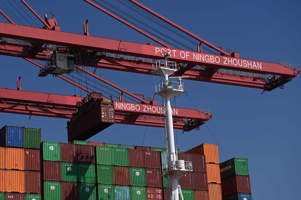 在浙江寧波舟山港梅山港區(qū)碼頭,大型設(shè)備在吊運集裝箱(2024年1月24日攝,無人機照片)。新華社記者 黃宗治 攝