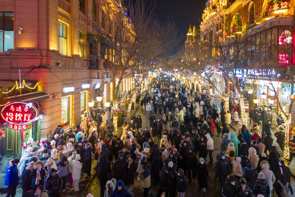 2024年1月9日,游客在哈爾濱百年老街中央大街上游玩(無人機照片)。新華社記者 張濤 攝