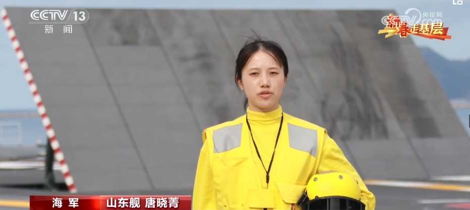 引導(dǎo)員唐曉菁的工作是負(fù)責(zé)引導(dǎo)艦載機(jī)就位、起飛。由于甲板上設(shè)備眾多,她的一舉一動(dòng)都至關(guān)重要,戰(zhàn)機(jī)起飛時(shí),她的戰(zhàn)位距離飛機(jī)發(fā)動(dòng)機(jī)只有不到20米。