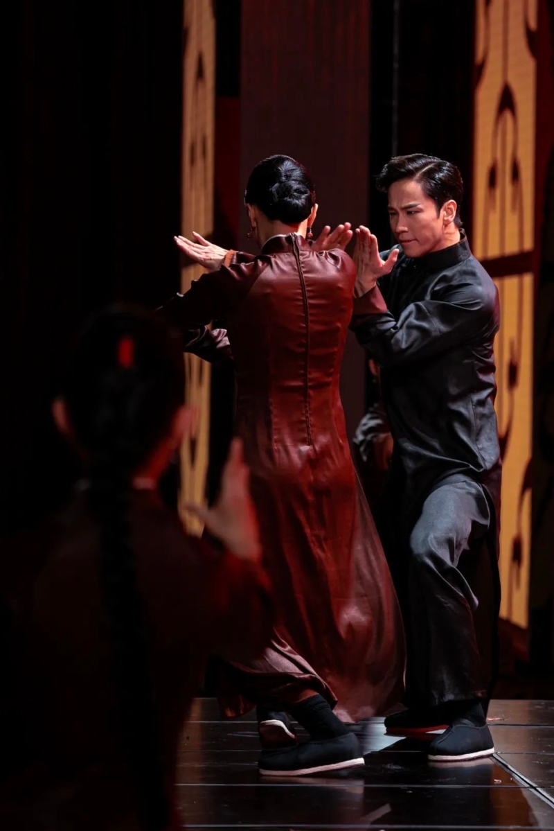 密集的鼓點(diǎn)聲中,一道巨大的人像剪影出現(xiàn)在黃褐色的巨幕上,馬步牢固、拳拳帶風(fēng)。目光正隨著人影挪不開眼,只見一個(gè)騰空飛旋過后,“葉問”同步從屏后翻旋而出,來到臺(tái)前。那人那影,一時(shí)間讓人恍惚,什么叫“形影相隨”,什么叫“弄影團(tuán)風(fēng)”,如今就在眼前!