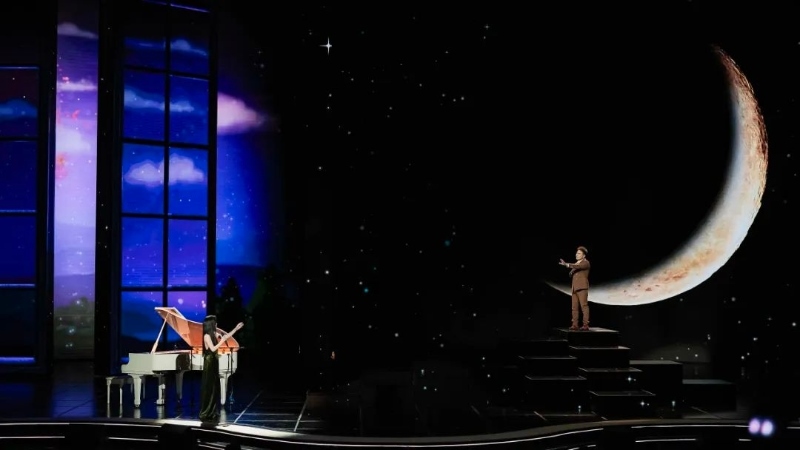 歌詞迅速修改到位,但舞臺(tái)的呈現(xiàn)成了讓人反復(fù)琢磨的問題。如何表現(xiàn)“想見卻無(wú)法相見”的感覺?如何營(yíng)造恰到好處的絲絲愁緒?從初次彩排時(shí)用秋千承載思念,到二排時(shí)改用燈光打造“兩個(gè)空間”,幾番嘗試總讓人感覺“還差點(diǎn)兒味道”。最后臺(tái)長(zhǎng)提議,用“剪影”去暈染思念的情緒,可以考慮用蘇軾的“人有悲歡離合,月有陰晴圓缺”的意境,以月亮為背景。這一下子打開了大家的思路。