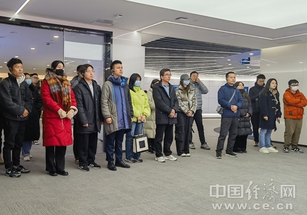 2023年12月18日,浙江大學(xué)師生代表隨團(tuán)在浙江杭州中國視谷調(diào)研。左二為浙江大學(xué)學(xué)生蔡安禧,左三為浙江大學(xué)學(xué)生金姚烗,左四為浙江大學(xué)馬克思主義學(xué)院教師陳曉偉。(中國經(jīng)濟網(wǎng)記者 王巖/攝)