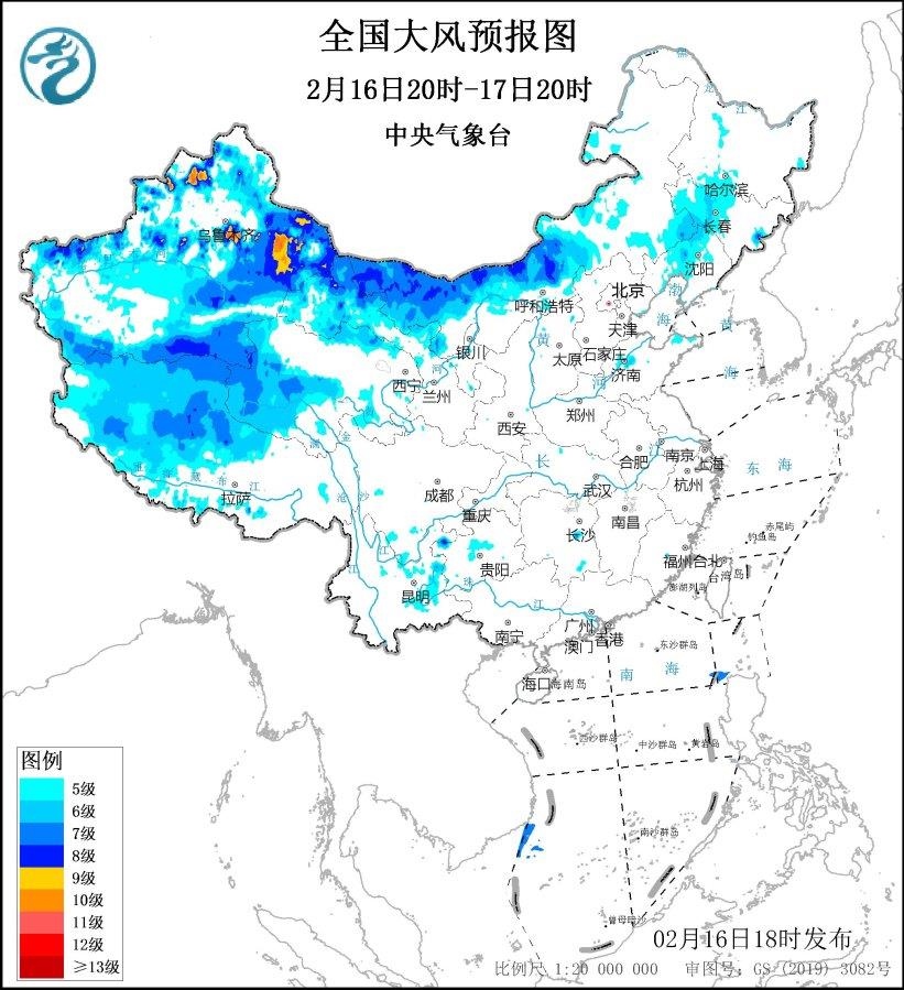 2月17日20時(shí)至18日20時(shí),新疆北疆東部和南疆盆地、內(nèi)蒙古西部、青海西南部、西藏西部、甘肅西部等地將有5~7級(jí)、陣風(fēng)8~9級(jí)的大風(fēng),新疆山口地區(qū)風(fēng)力可達(dá)10級(jí),陣風(fēng)12~13級(jí);黃海大部海域、東海北部海域?qū)⒂?級(jí)、陣風(fēng)8~9級(jí)的大風(fēng)。