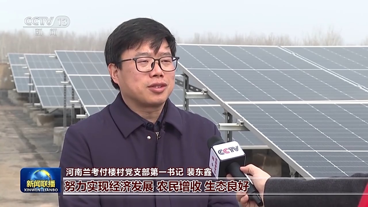河南蘭考付樓村黨支部第一書記 裴東鑫:習(xí)近平總書記要我們在綠色發(fā)展中,努力實現(xiàn)經(jīng)濟(jì)發(fā)展、農(nóng)民增收、生態(tài)良好。我們大力實施了整個村莊的零碳化改造?,F(xiàn)在我們?nèi)迥旯夥l(fā)電量超過120萬度,完全滿足我們整個村子的用電需求,我們村集體一年增收十幾萬元。