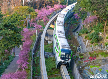 重慶:美人梅相繼綻放,列車穿行其間仿佛“開往春天”。