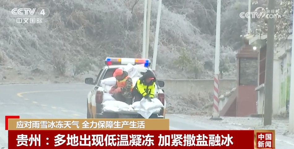 受強(qiáng)冷空氣影響,貴州部分地區(qū)出現(xiàn)低溫凝凍天氣。銅仁萬(wàn)山區(qū)部分路段的覆冰厚度超過(guò)1厘米,多部門聯(lián)動(dòng),對(duì)凝凍路段進(jìn)行撒鹽融冰,并加強(qiáng)對(duì)事故路段和重點(diǎn)路段的巡查和管控,提醒來(lái)往車輛做好防滑措施。