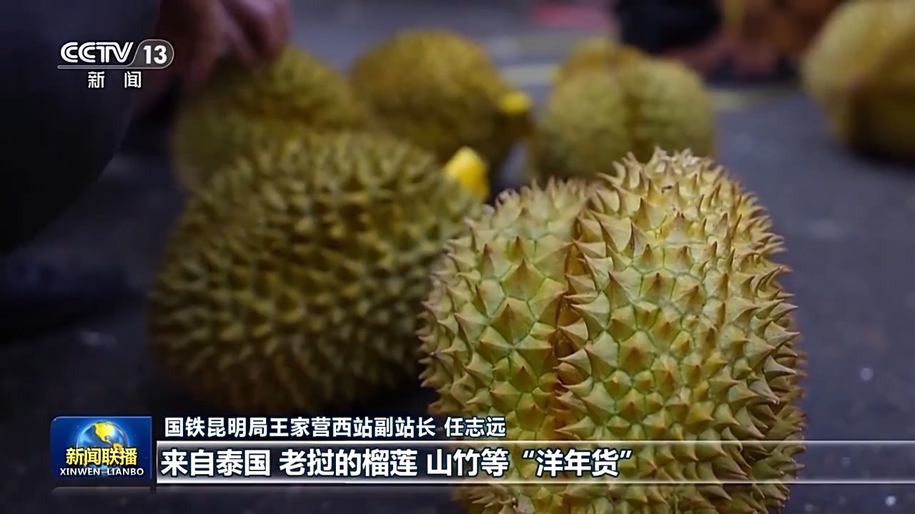 國鐵昆明局王家營西站副站長 任志遠:今年以來,車站進出口貨物明顯增加,來自泰國、老撾的榴蓮、山竹等“洋年貨”源源不斷運抵。國內的“國貨潮牌”陸續(xù)運往東南亞國家。