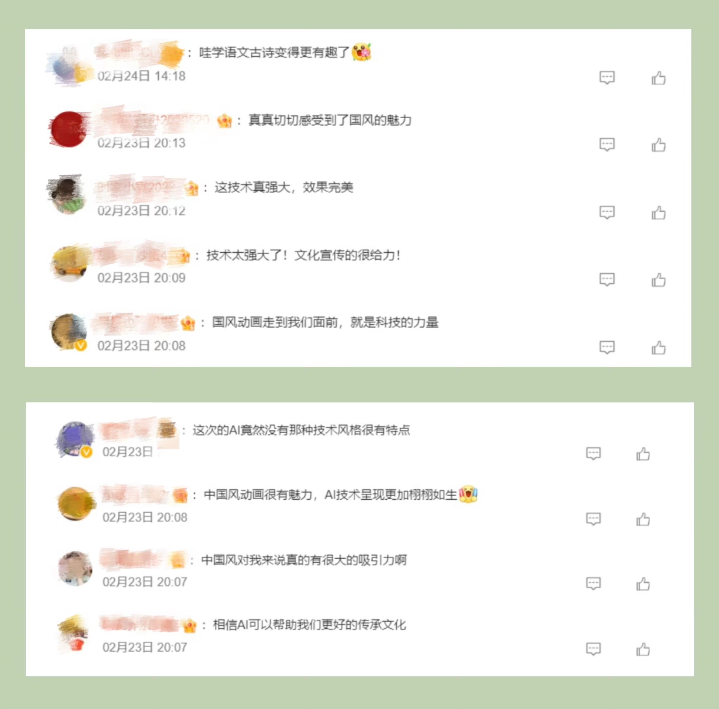 節(jié)目探索詩(shī)畫(huà)融通的國(guó)風(fēng)動(dòng)畫(huà)片新呈現(xiàn),讓廣大青少年進(jìn)一步加深了對(duì)中國(guó)經(jīng)典詩(shī)詞的理解和喜愛(ài)?!癆I”“總臺(tái)”“千秋詩(shī)頌”等成為網(wǎng)友熱議高頻詞。截至2月27日20:00,話題#千秋詩(shī)頌#閱讀量超791萬(wàn)次。網(wǎng)友紛紛留言:“看到這個(gè)系列片,我真的深深感受到了中國(guó)傳統(tǒng)文化的深厚底蘊(yùn)。這些古詩(shī)詞深入骨髓,流淌在我們的血液中,是我們國(guó)家的文化符號(hào)”“以AI為媒,央視制作的這部國(guó)風(fēng)動(dòng)畫(huà)片傳承了經(jīng)典,喚醒了古韻的新生命”“唯美的畫(huà)面讓人動(dòng)容,用視覺(jué)的形式了解《別董大》這一首古老的詩(shī)歌更別有一番韻味”“這種科技與動(dòng)畫(huà)片的結(jié)合,恰好是現(xiàn)在小朋友們和大朋友們所需要的”。