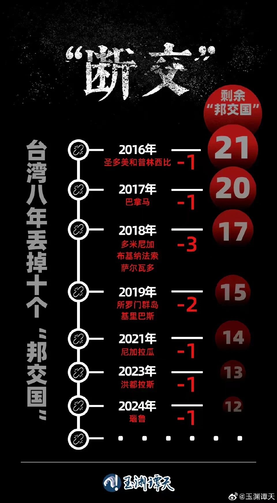 這一輪“斷交”,有一個(gè)突出特點(diǎn),臺(tái)灣當(dāng)局所謂重要的“邦交國(guó)”全部與其斷交。