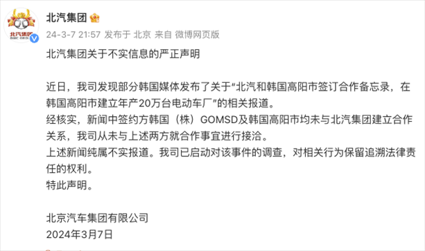 ·北汽集團(tuán)聲明:“在韓國高陽建廠”信息不實。