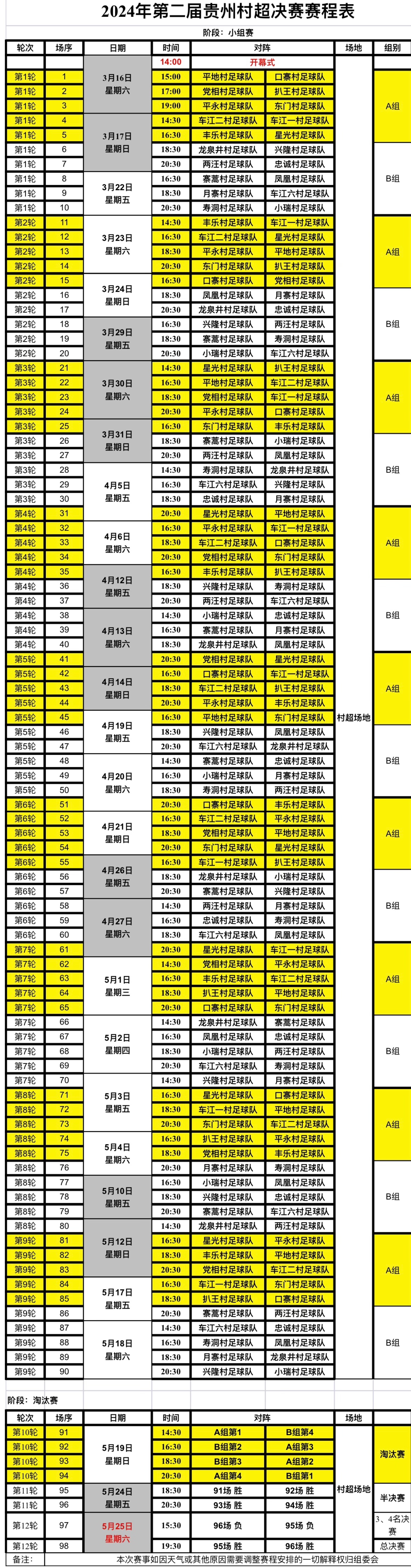 決賽階段的“村超”從3月16日開始,每周五到周日都會保證有比賽,逢節(jié)假日還會舉行加賽。球迷們只要在出發(fā)前記得確認(rèn)一下賽程表即可。建議可以上午先到當(dāng)?shù)赜斡[,體驗(yàn)民俗文化,晚上再去觀看“村超”賽事。