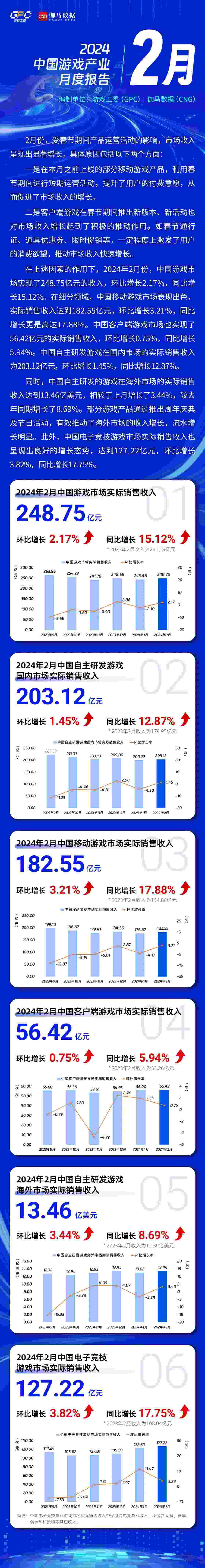 央視網(wǎng)消息:3月20日,據(jù)中國音數(shù)協(xié)游戲工委官微消息,2024年2月中國游戲產(chǎn)業(yè)月度報告發(fā)布。報告顯示,2024年2月份,中國游戲市場實現(xiàn)了248.75億元的收入,環(huán)比增長2.17%,同比增長15.12%。在細分領域,中國移動游戲市場表現(xiàn)出色,實際銷售收入達到182.55億元,環(huán)比增長3.21%,同比增長更是高達17.88%。中國客戶端游戲市場也實現(xiàn)了56.42億元的實際銷售收入,環(huán)比增長0.75%,同比增長5.94%。中國自主研發(fā)游戲在國內(nèi)市場的實際銷售收入為203.12億元,環(huán)比增長1.45%,同比增長12.87%。
