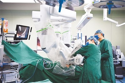 主刀醫(yī)生坐在控制臺旁,像駕駛汽車一樣,雙腳踩在踏板上,手指套上控制桿。隨著醫(yī)生手指輕微移動,精巧的機(jī)械手臂在患者體內(nèi)靈活翻轉(zhuǎn)、穿針引線……這是一場機(jī)器人手術(shù)。